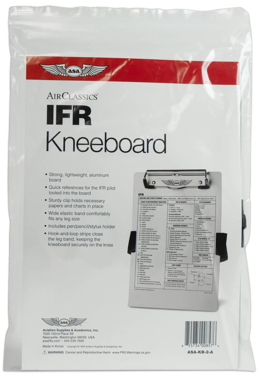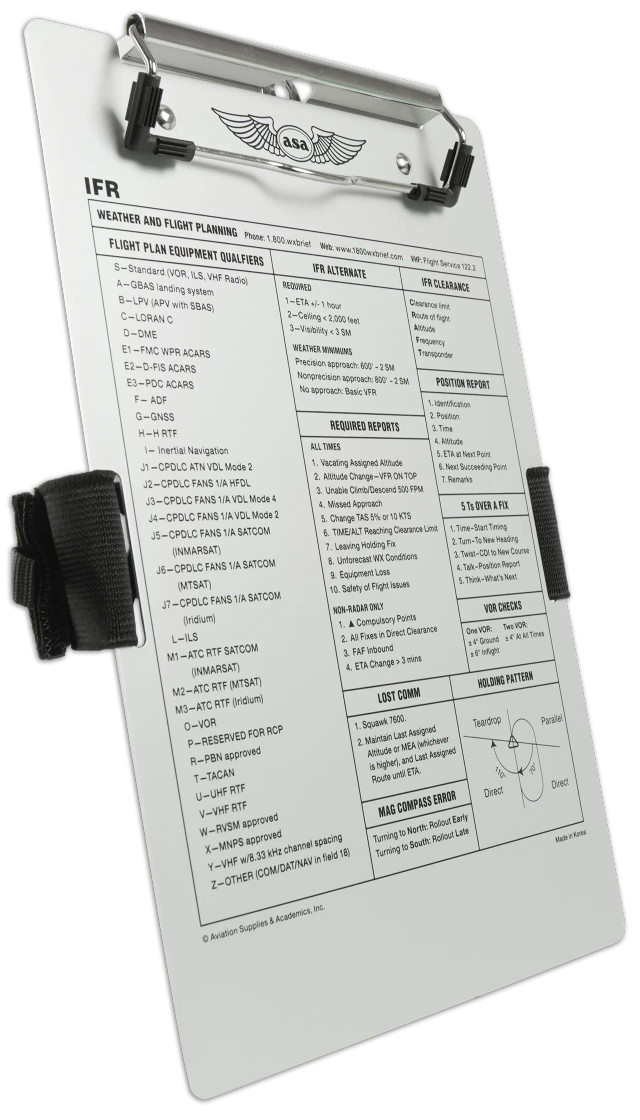 La resistente piernera IFR de aluminio cepillado es ideal para organizar los datos de vuelo, ya que proporciona una superficie sólida para tomar notas durante el vuelo y un acceso rápido a información IFR importante en forma de placa permanente. Esta nueva versión incluye información actualizada que refleja las necesidades de la cabina moderna, como recursos meteorológicos y de planificación de vuelo, requisitos de equipos para el plan de vuelo, requisitos de aeropuertos alternativos IFR, informes, comunicaciones perdidas y mucho más. Fabricada en Corea.